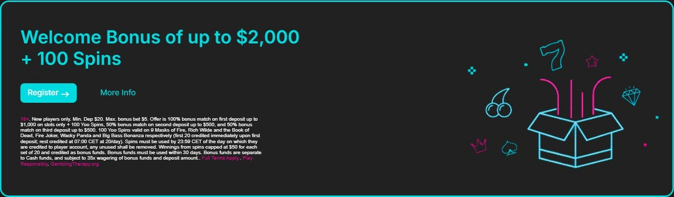 19+ | New players only. Min. Dep $20. Max. bonus bet $5. Offer is 100% bonus match on ...first deposit up to $1,000 on slots only + 100 Yoo Spins, 50% bonus match on second deposit up to $500, and 50% bonus match on third deposit up to $500. 100 Yoo Spins valid on 9 Masks of Fire, Rich Wilde and the Book of Dead, Fire Joker, Wacky Panda and Big Bass Bonanza respectively (first 20 credited immediately upon first deposit; rest credited at 07:00 CET at 20/day). Spins must be used by 23:59 CET of the day on which they are credited to player account, any unused shall be removed. Winnings from spins capped at $50 for each set of 20 and credited as bonus funds. Bonus funds must be used within 30 days. Bonus funds are separate to Cash funds, and subject to 35x wagering of bonus funds and deposit amount..