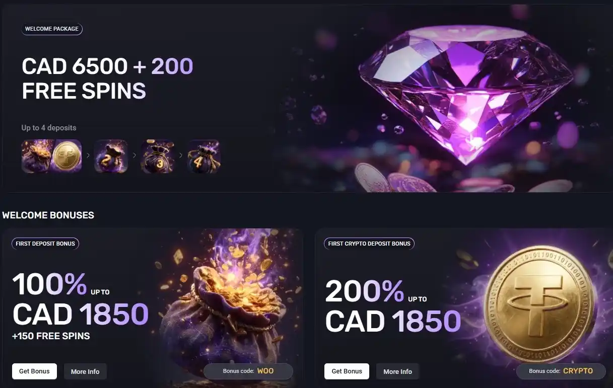 When opening Woo Casino for the first time, the interface presents a dark theme with large banners and a layout designed to stand out visually. At the same time, navigation remains straightforward. The left-side menu gives direct access to games, promotions, and payments, while the search bar is clearly visible at the top, making it easy to find content without unnecessary clicks.